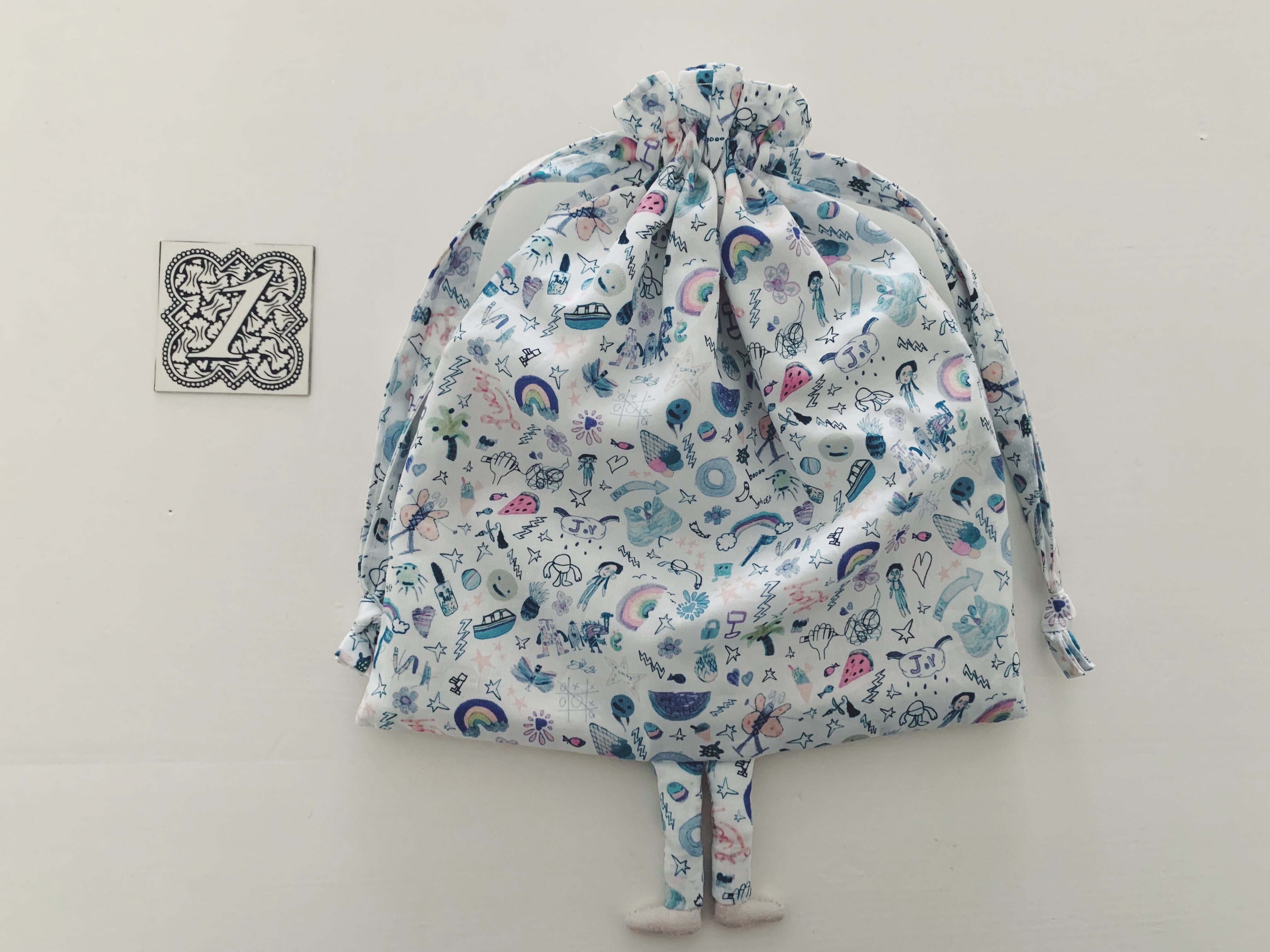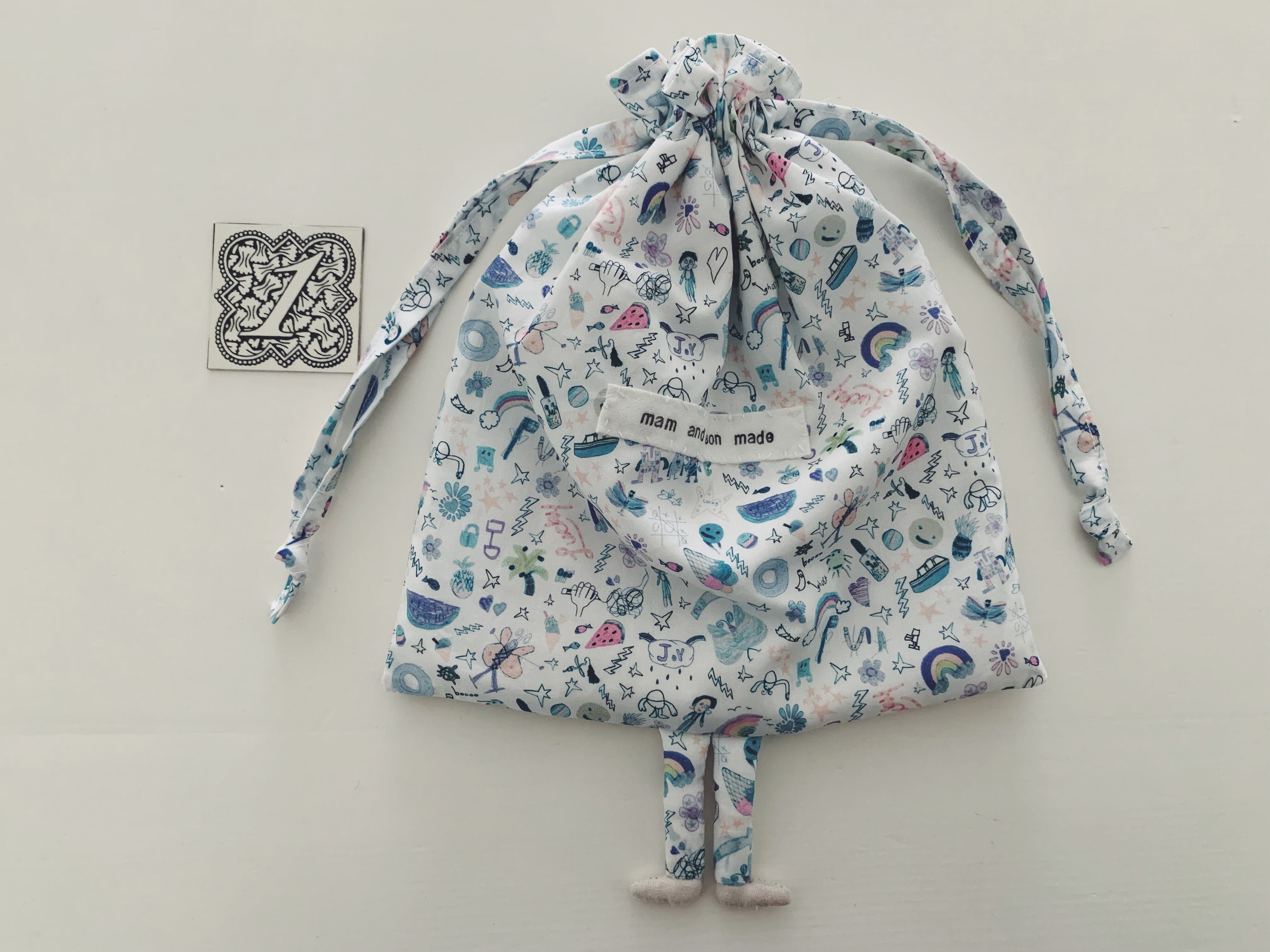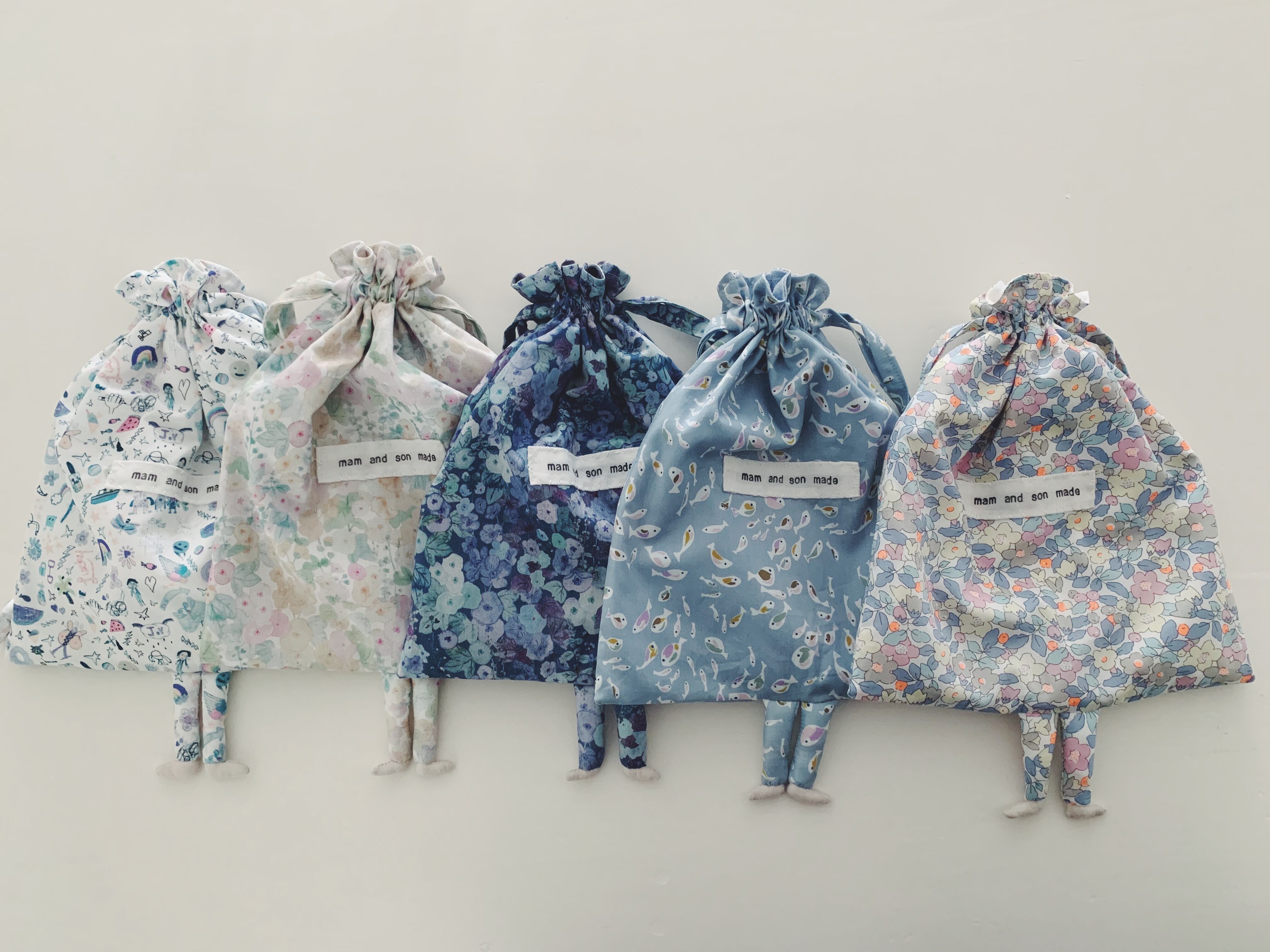 今の気分なお気に入りのlibertyの生地で、足をつけた一味違う巾着を作りました。巾着1枚につき、同柄のlibertyマグネットを勝手ながらオマケでつけております^^