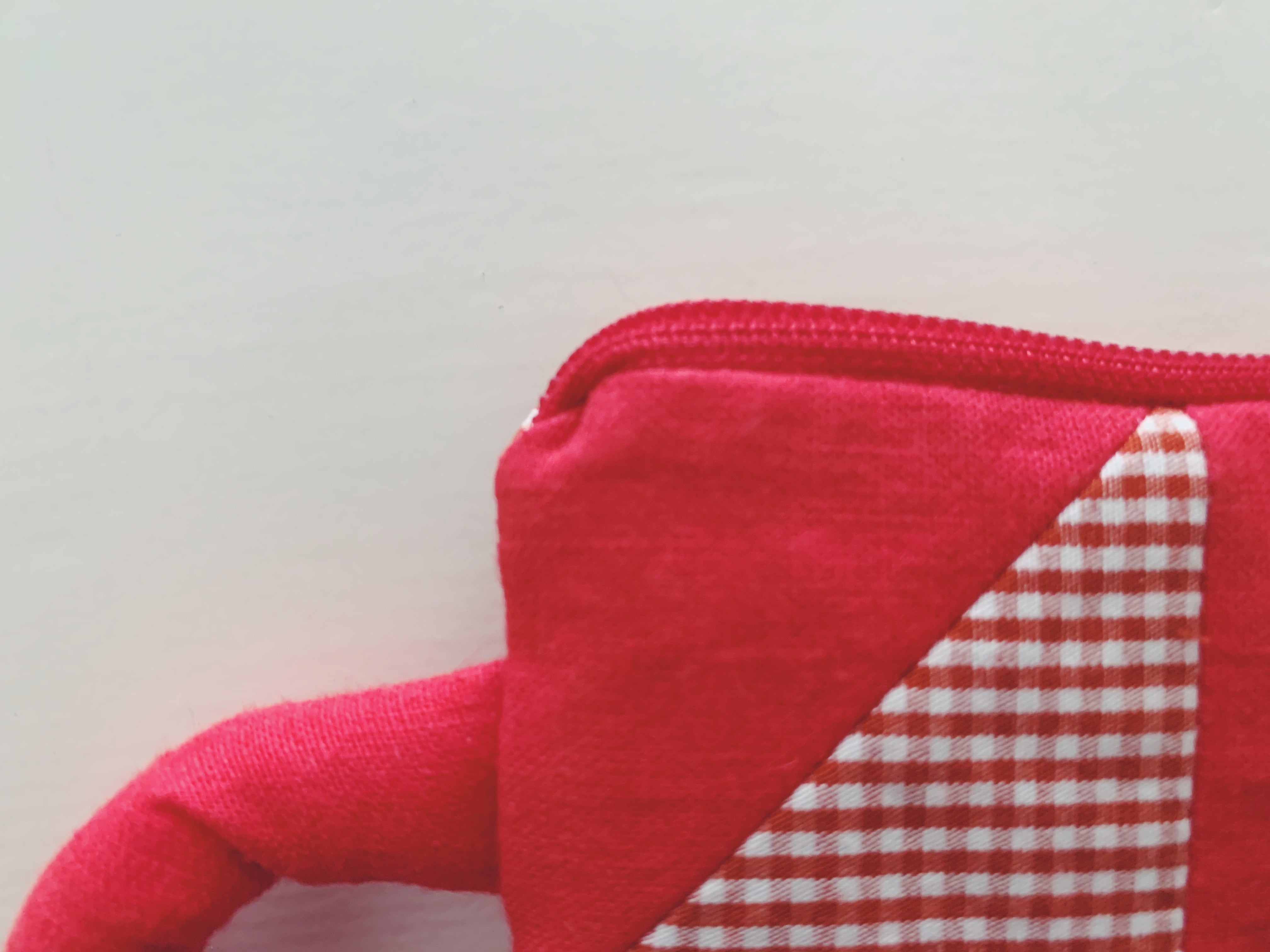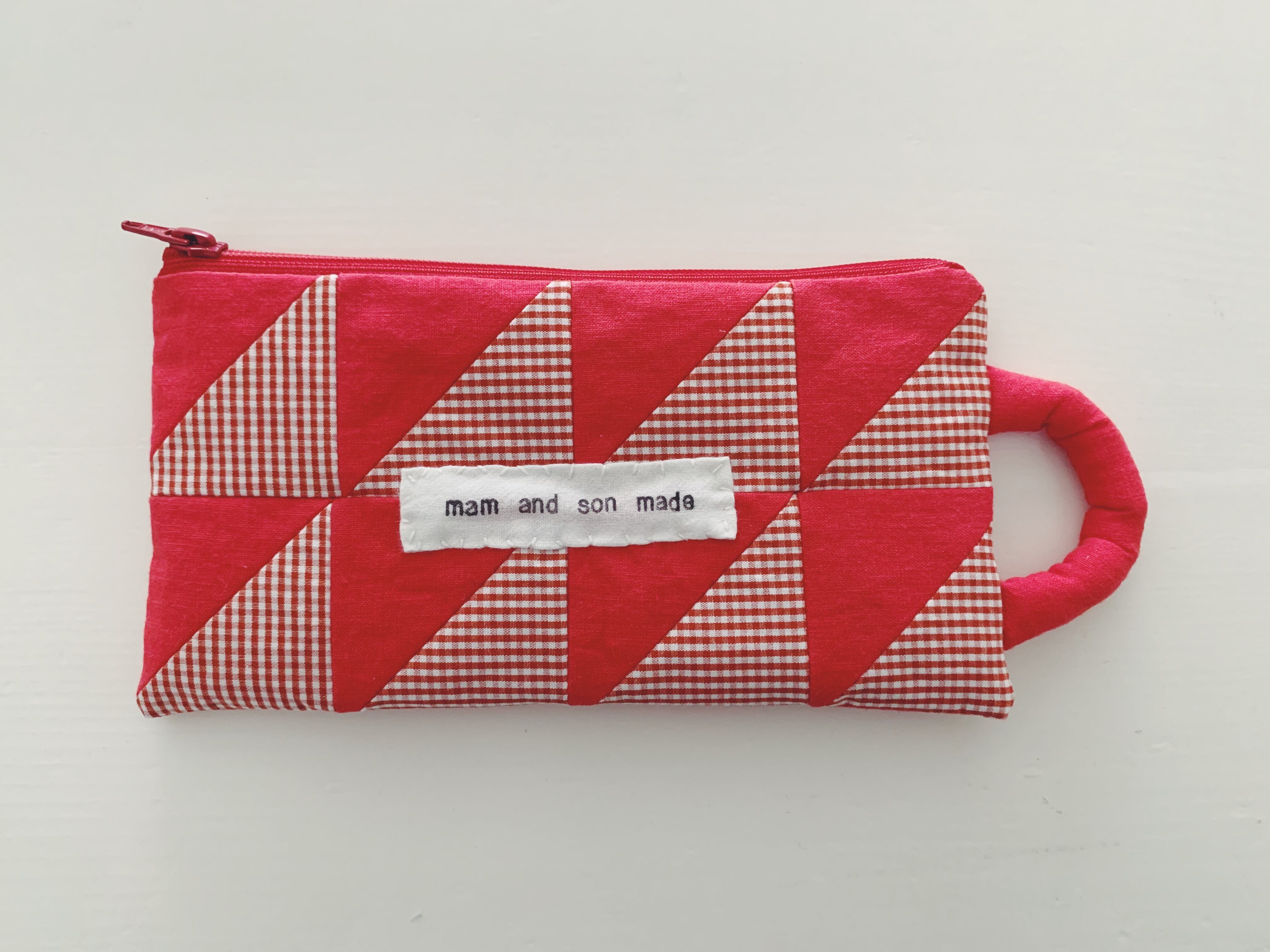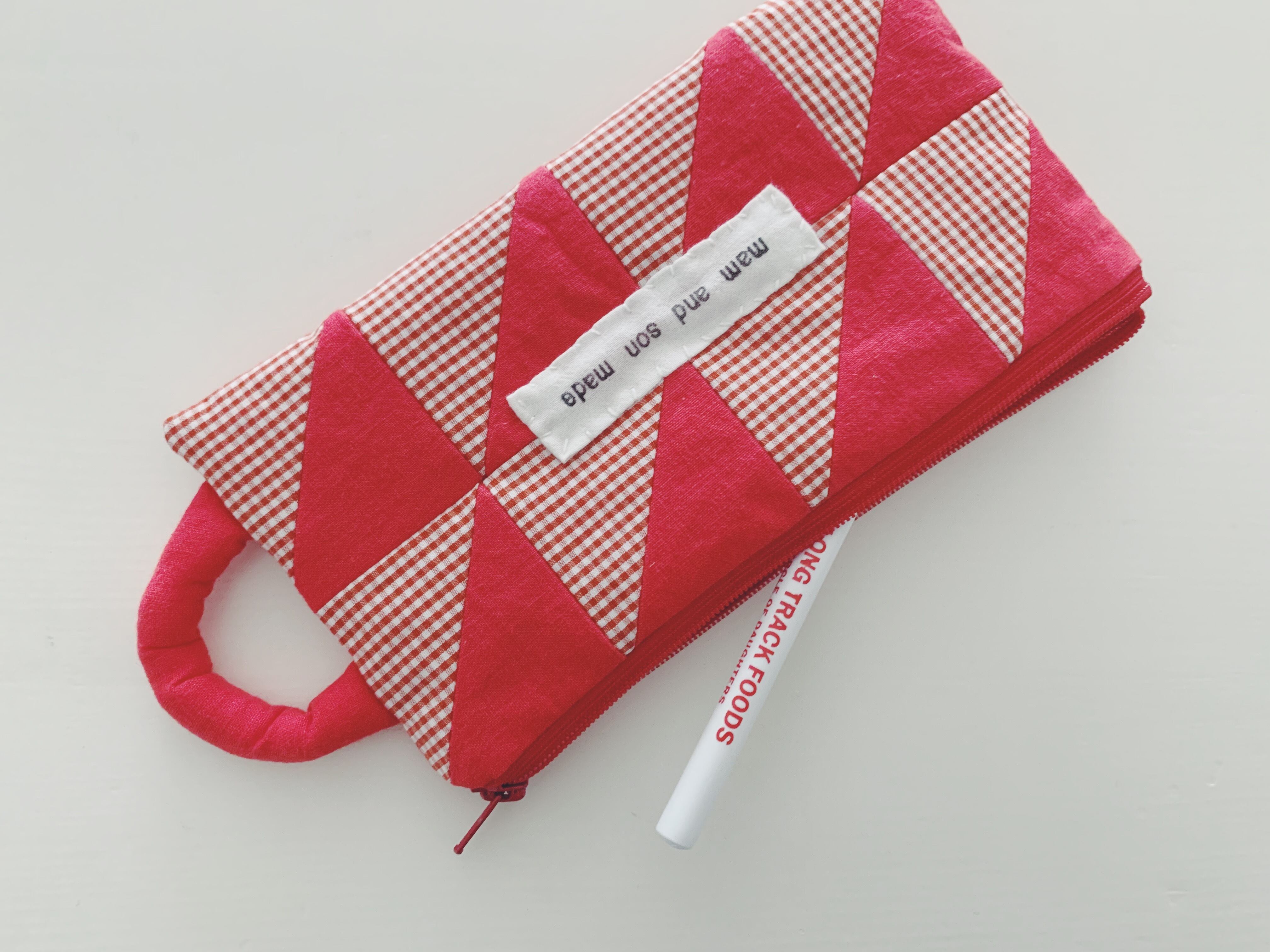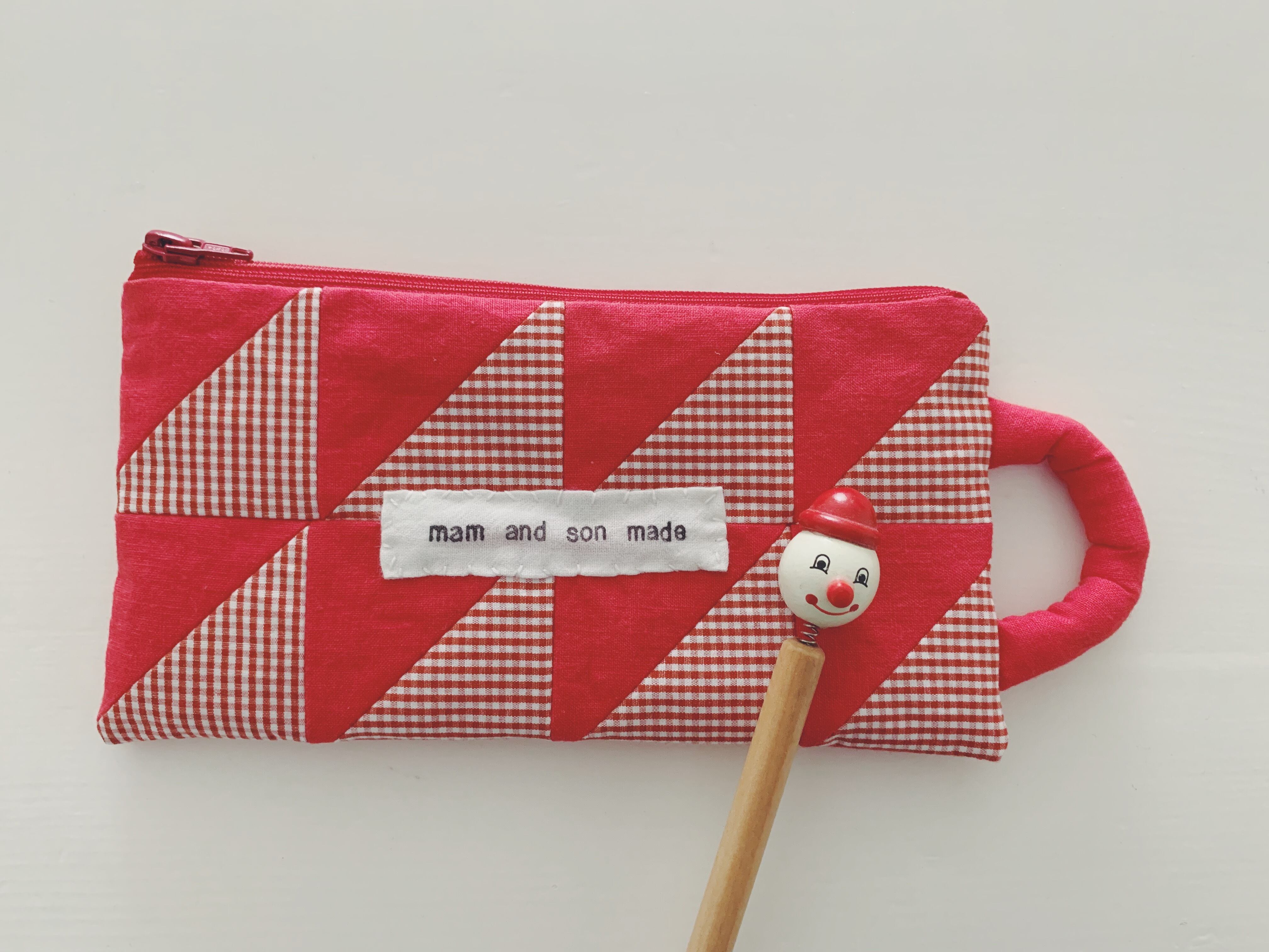赤いハーフリネンと赤の細かめのギンガムチェックを合わせてパッチワークで仕上げたペンケースサイズのポーチです。裏と表で布の合わせ方を変えています。
