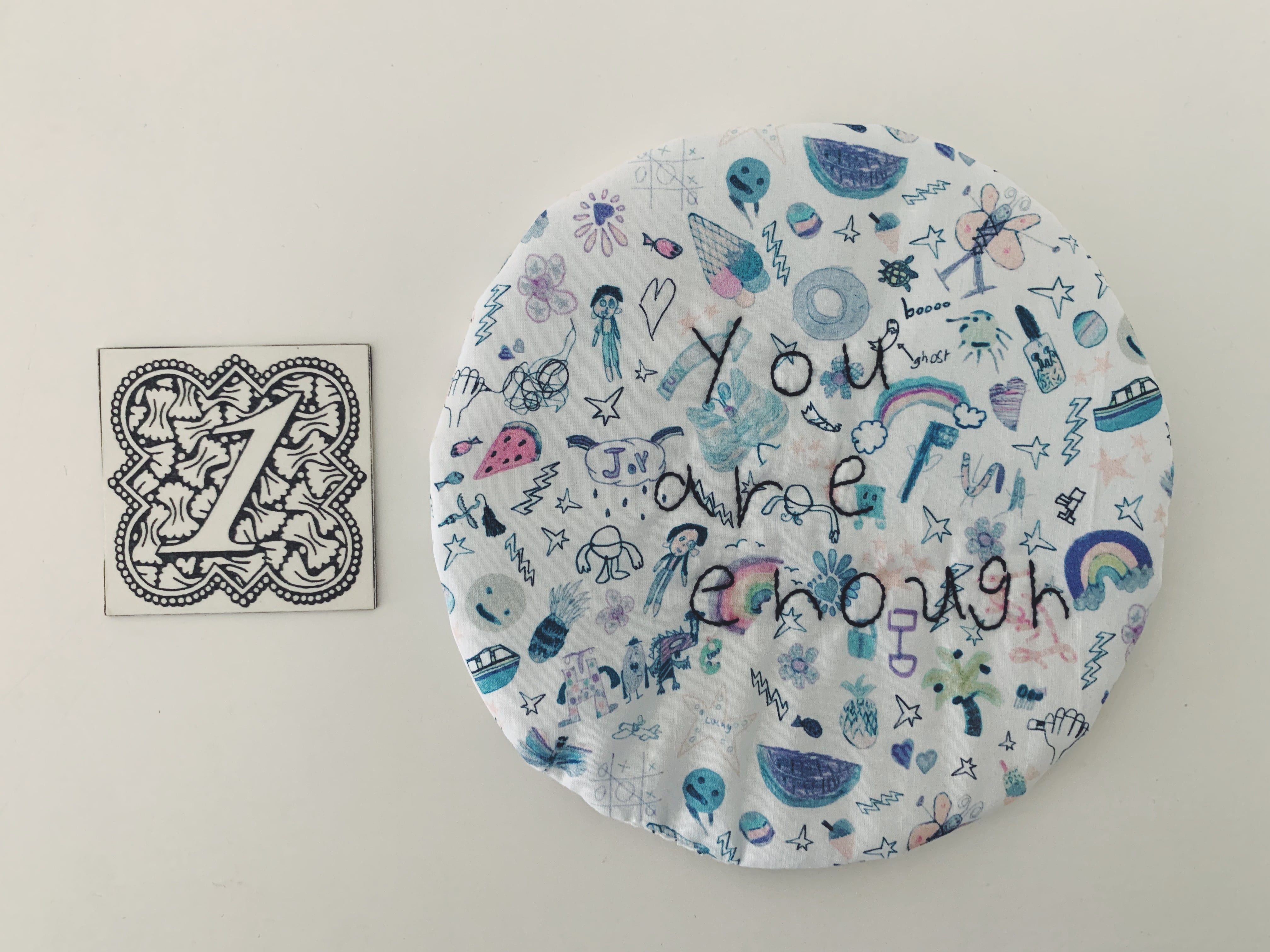 liberty生地で作ったマンマルの刺繍入りコースターです。