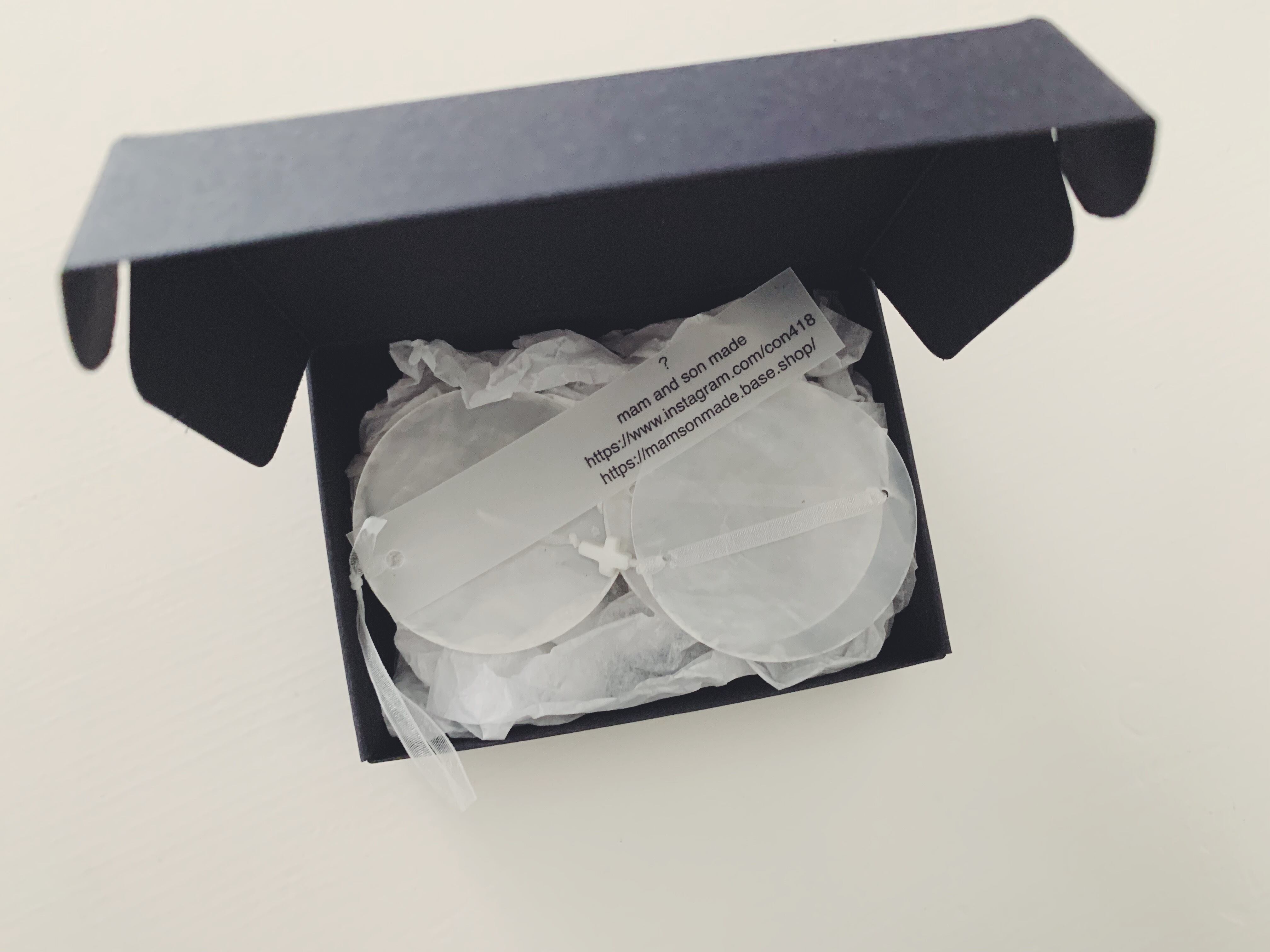 半透明な素材に合わせ、オーガンジーのリボンで仕上げ同じく天然素材の小さなクロスを合わせました^^