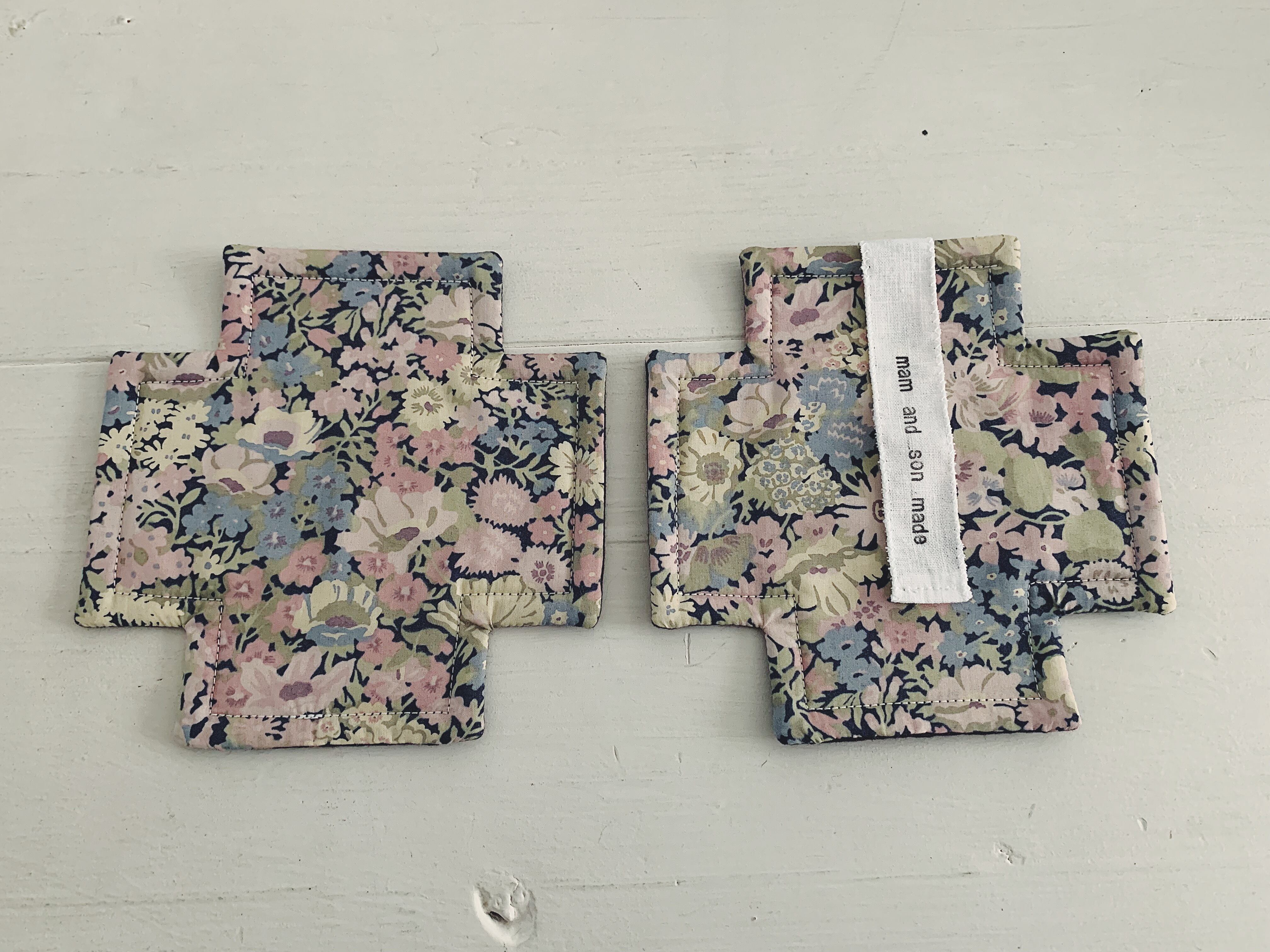 libertyタナローンのThorpeと黒のハーフリネンで作った縦横13㎝程のクロス型コースターです。