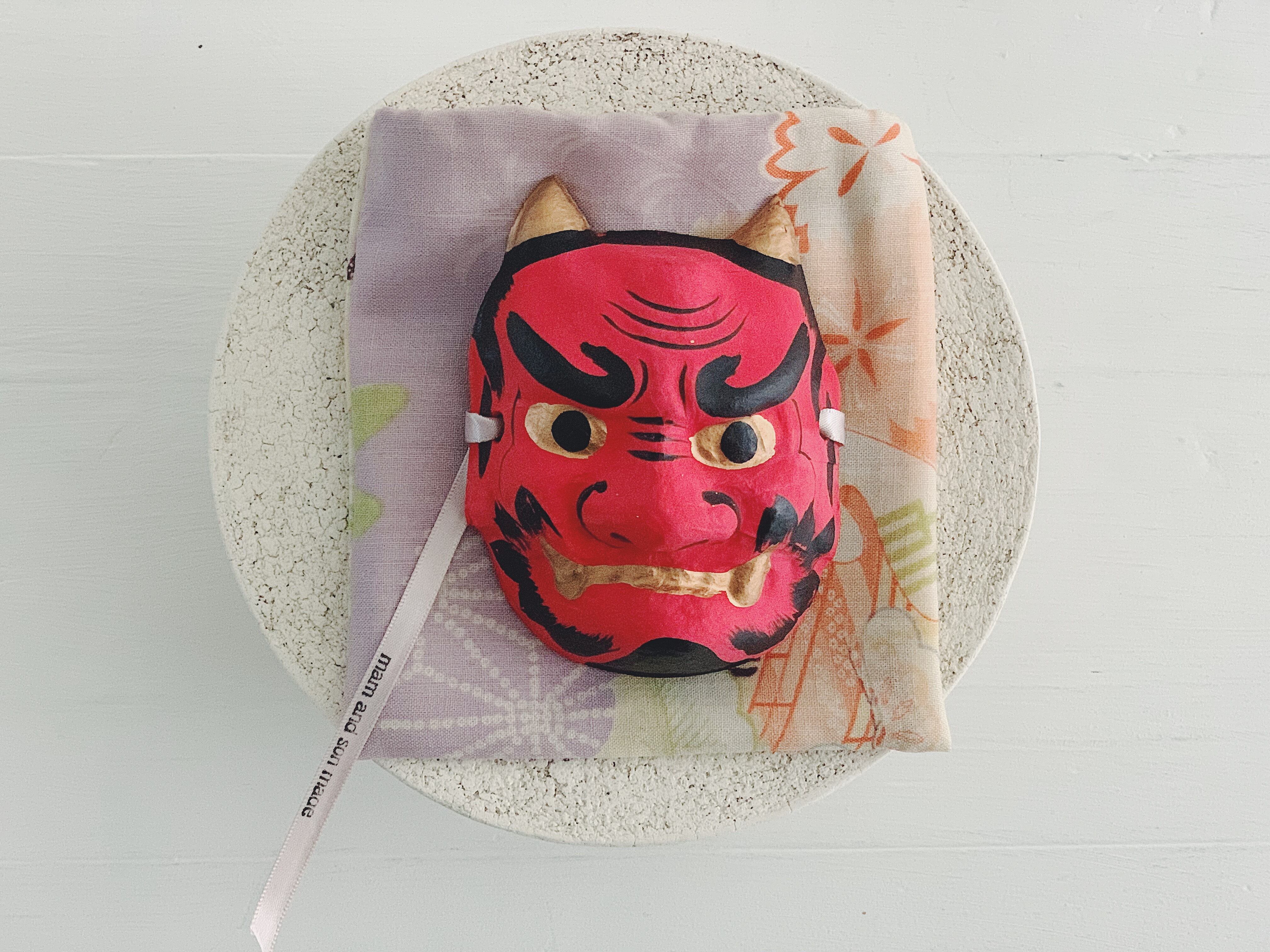 和紙でできた赤鬼の面と、古い着物の巾着のセットです