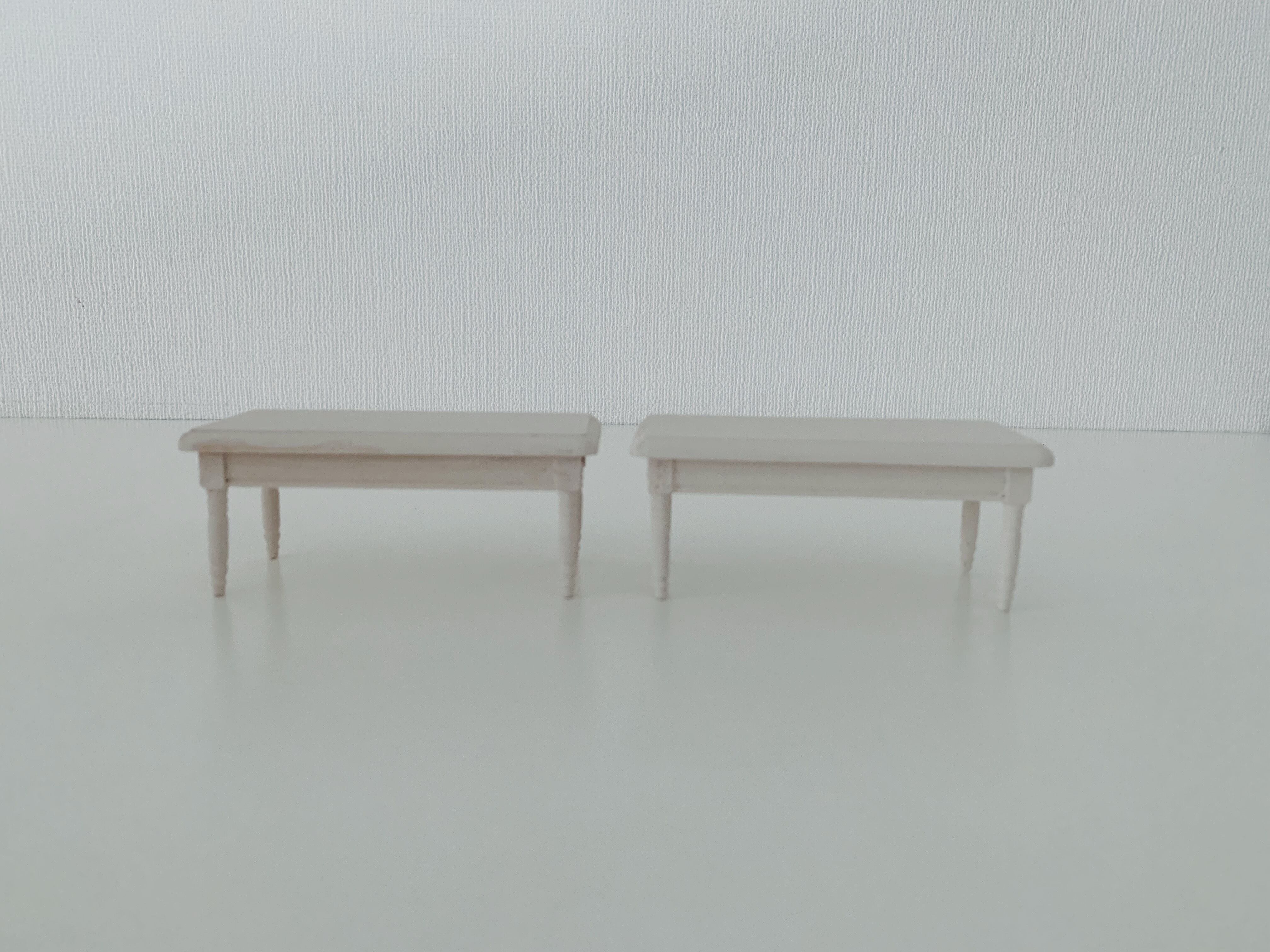 アイボリーよりの優しいベージュでペイントした、ミニチュアの引き出しがついたテーブルです