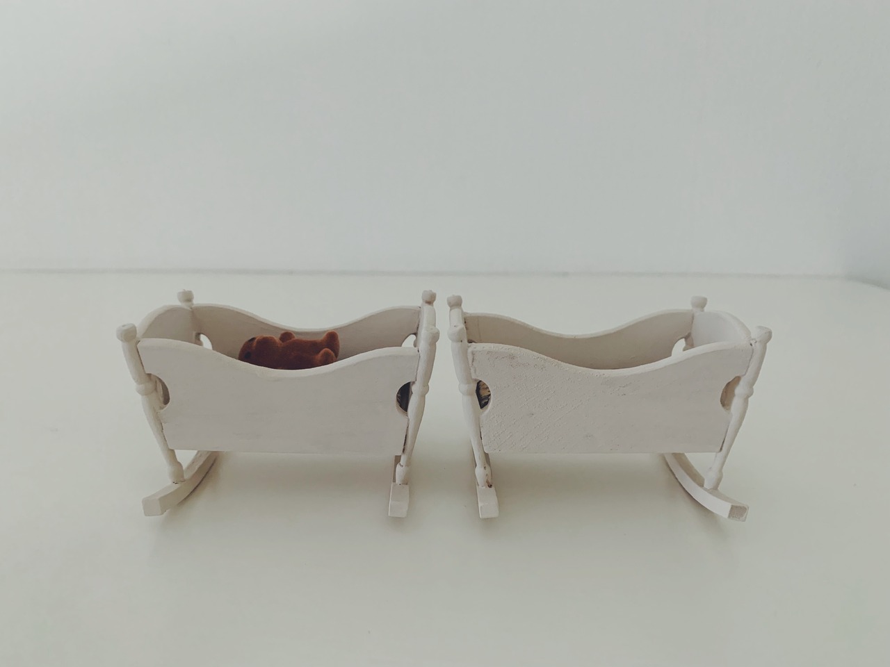 アイボリーよりの優しいベージュでペイントしたミニチュアのベビーベッド?です